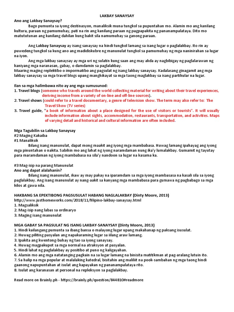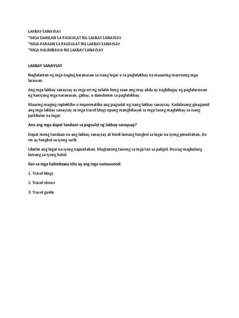 25032020 nakasisira ito sa ating magandang kalikasan. Mga realisasyon o mga natutuhan sa ginawang paglalakbay. Sa pagsulat laging baunin sa isipan ang depenisyong ibinigay ni Nonon Carandang na ang lakbay-sanaysay at kina papalooban ng tatlong.