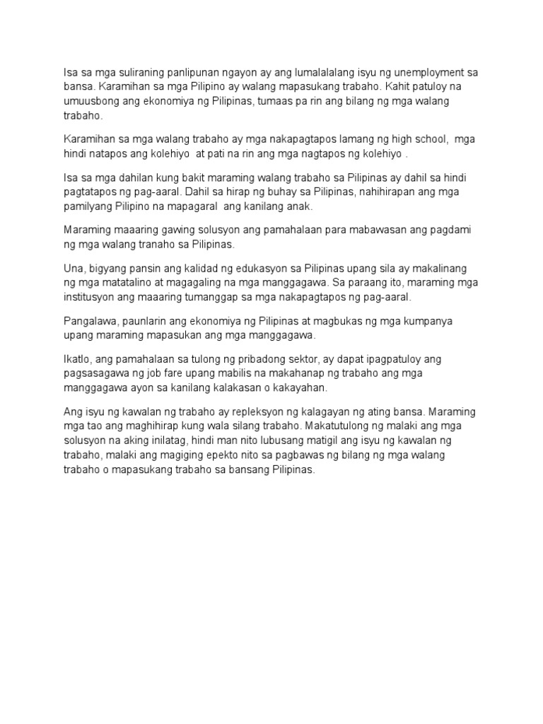 Ang ibig sabihin nito ay ang mga trabaho na nakalatag at yung mga negosyong nangangailangan sa ating. Sanaysay Tungkol Sa Kahirapan 10 Halimbawa Ng Sanaysay Tungkol Sa Kahirapan Ng Buhay Sa Pilipinas Tagalog Mga napapanahong isyu ngayon. Ang Kawalan ng Trabaho ay isang suliraning panlipunan na kinakaharap ng ating bansang Pilipinas noon hanggang sa kasalukuyan.