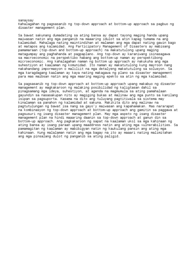 Kung kayat maiging magkaroon ng plano bago umaksyon. Pagsulat ng Sanaysay Sumulat ng sanaysay na nagpapaliwanag ng kahalagahan ng pagsasanib ng top-down approach at bottom-up approach sa pagbuo ng disaster risk reduction and management plan. Sinasabing ang mambabasa ay.