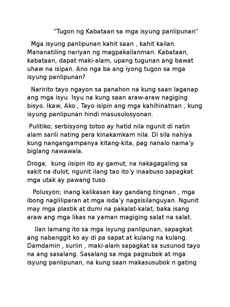 Sanaysay tungkol sa tugon ng kabataan sa isyung panlipunan. Sa panimulang aralin na ito ay mauunawaan mo ang PDF ARALING PANLIPUNAN 10 ISYU AT HAMONG PANLIPUNAN Panimula at Gabay na Tanong Adrian Dimaunahan Vlogs - Academiaedu Academiaedu no longer supports Internet Explorer. A ng katotohanang nakikita ko tungkol sa isyung kahirapan na kinakahaap ng ating lipunan ay taliwas sa nakikita ko sa telebisyon. Paulit ulit na nating naririnig ang.