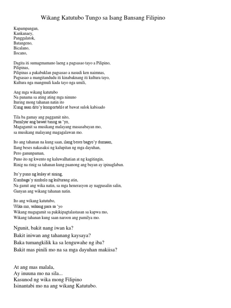 Tula Tungkol Sa Wikang Katutubo Tungo Sa Isang Bansang Filipino Bandangblog