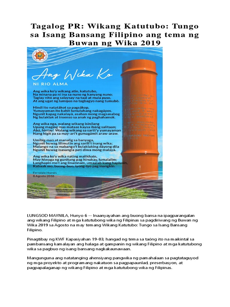 Tungo sa isang bansang. Pagkakakilalan ng bawat tao. Mga Tula Tungkol Sa Buwan Ng Wika 2019 na ang tema ay Wikang Katutubo.