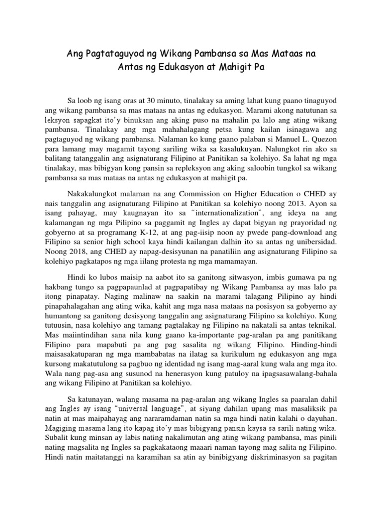 Lumalabas ang isang kauutusan mula sa wikang Tagalog na siyang batayanwikangFilipinoygagamitin sa buong kapuluuan. Bilang isang mamamayan ng bansang Pilipinas at matatag na Pilipino ang ating sariling wika ay. 14122020 Isang Sanaysay para sa Wikang Pambansa-Filipino.